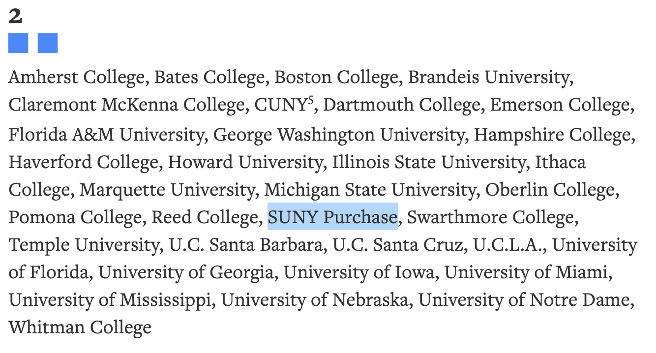 In response to Joshua Benton’s February 28th Nieman Lab article, “Is The New York Times’ newsroom just a bunch of Ivy Leaguers? (Kinda, sorta.),” I saw someone tweet the screenshot below—a collection of schools that the fewest in the Times newsroom attended—and remark in their tweet how surprised they were that anyone at the Times had gone to any SUNY school.