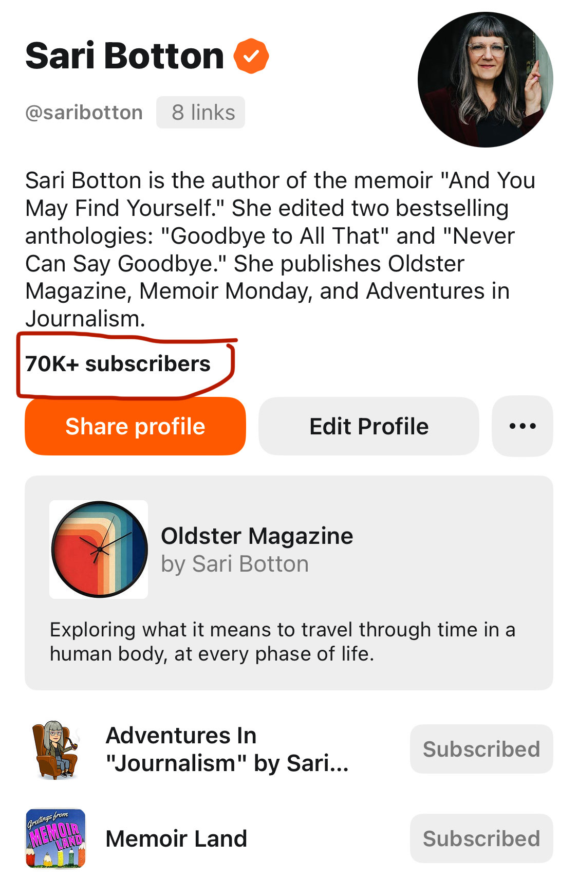 People are enjoying what I’m doing with both publications. Both keep growing, and I’m really proud of what I’ve created. Recently one essay from Oldster and another from Memoir Land were nominated for Pushcart Prizes by members of the Pushcart editorial board. Last year an essay from Oldster received notable mention in The Best American Essays, edited by Vivian Gornick. I seem to be doing something right, and I only hope I get to keep doing it. (🤞🏼 🙏 ) But it’s also totally freaking me out.