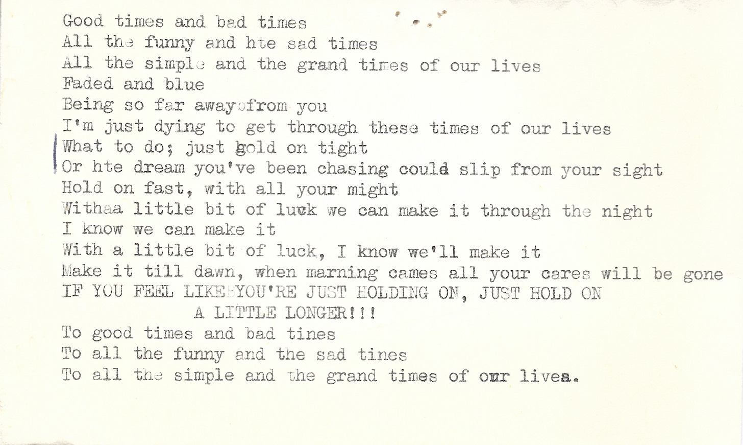 2. Here are the lyrics to “Good Times and Bad Times” by a band called Aztec Two-Step, which I typed (very badly, with some kind of mental block around how to type “the”) in 9th grade, a year before I studied (and failed) typing. The song was an anthem of sorts among close friends from sleep-away camp, my “tribe” of weirdo theater geeks who tended to be outcasts among our peers at home. These lyrics hung on a bulletin board in my bedroom along with a number of other bits of camp nostalgia and inspirational quotes encouraging me to “JUST HOLD ON A LITTLE LONGER” until the next summer rolled around.
