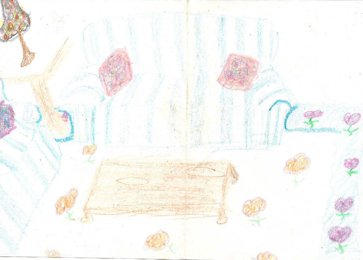 1. Here’s a crayon drawing I did in 1989 (I sure have been doing bad crayon drawings for a long time) of the living room I shared with my first husband in an apartment on the boardwalk in Long Beach, NY. We got married that June, and with some of the money we received as wedding gifts we bought overstuffed couches, country French-inspired blond wood furniture, dhurrie rugs, and dinnerware that reminded us of what Thirtysomething’s Hope and Michael had in their home.