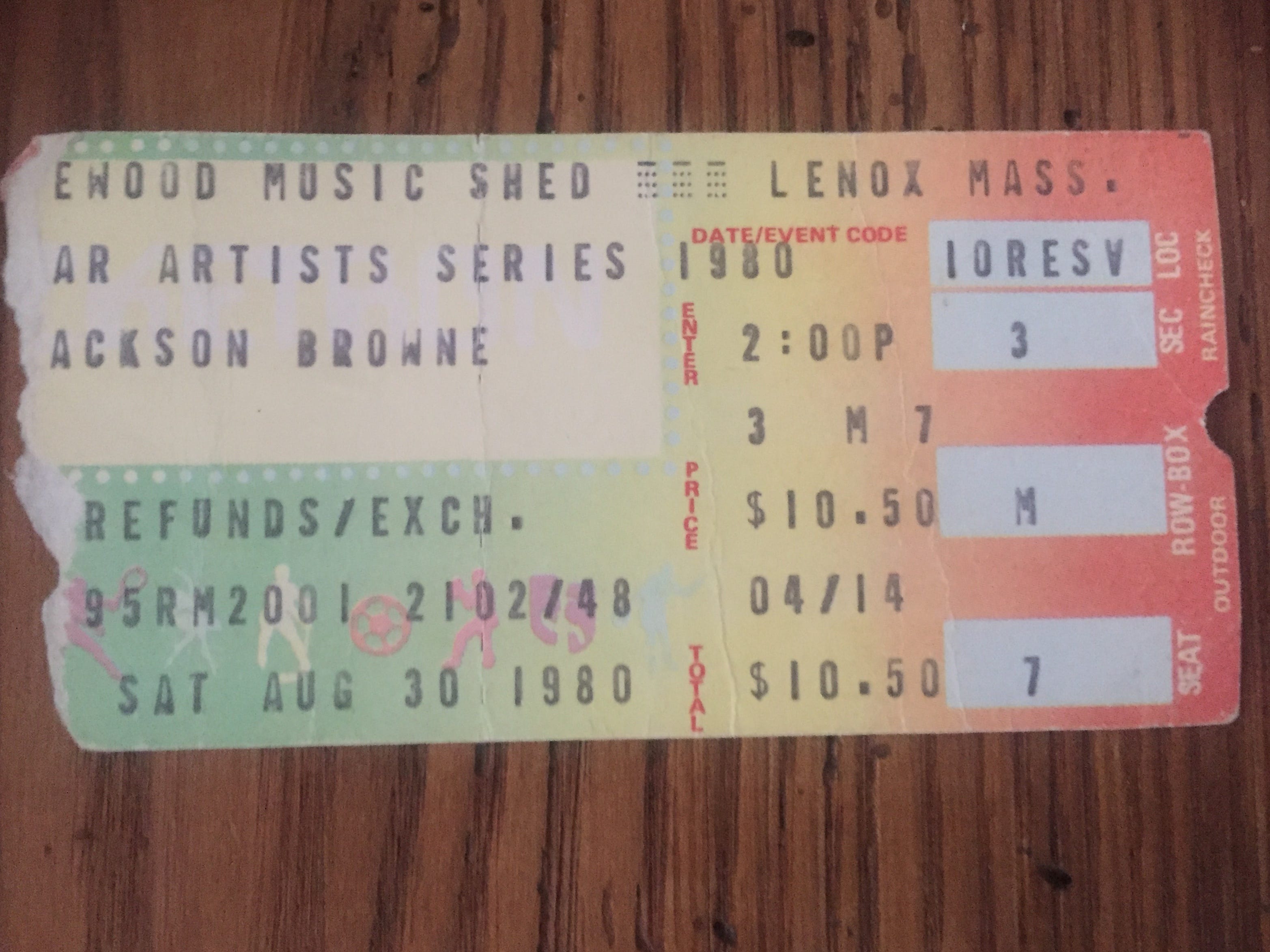 5. This is my ticket stub from the first concert I ever attended: Jackson Browne at Tanglewood in Lenox, Mass., August 30th, 1980, a couple of months before I turned 15. I had been hurt when my step-sister and her boyfriend—also my close friend—initially wouldn’t let me go with them to the Hold On, Hold Out tour. (We would draw more “hold on through the winter until next summer at camp” inspiration from that record.) Then another male friend’s date backed out and at the last minute, they let me tag along. I went, but didn’t know how to mask how insulted I still felt.