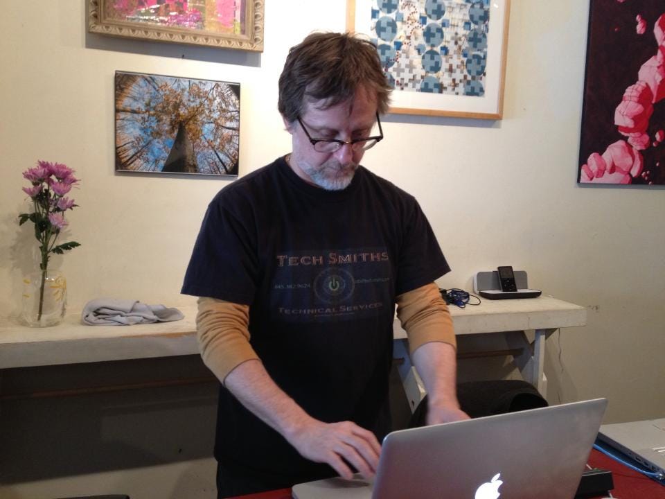 I mean, who ever heard of an art gallery and music venue inside of…a computer repair shop? That would have been my husband’s shop, Tech Smiths Technical Services, which in 2021 ultimately became a casualty of the pandemic. Brian originally opened it in 2009 in a small space New Paltz. In 2013, a friend offered Brian a new, larger space in uptown Kingston, next door to her wonderful restaurant, Boitson’s, now another pandemic casualty.