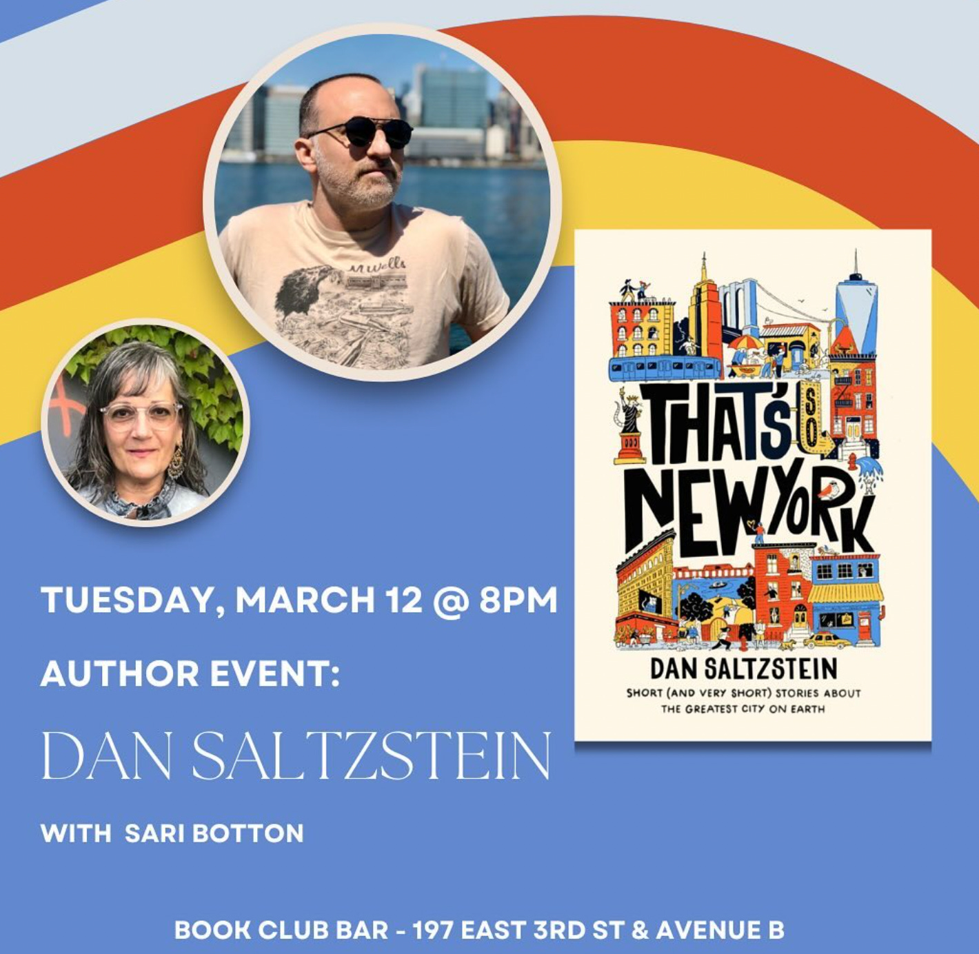 And now I’m preparing to speak in Blaise Allysen Kearsley’s “Writing New York: Personal Narratives That Could Only Happen Here” workshop in February, and to be in conversation with New York Times editor Dan Saltzstein about his forthcoming NYC anthology, That’s So New York: Short (and Very Short) Stores About the Greatest City on Earth, at Book Club Bar in the East Village on March 12th.