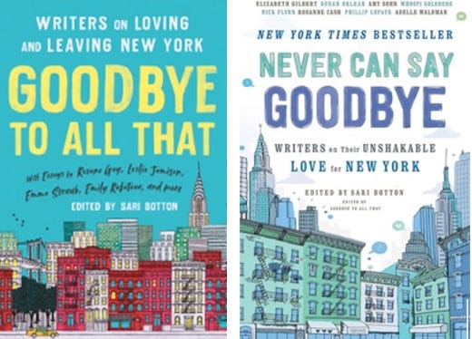 Specifically, I’m talking about possibly adding a fourth newsletter to my little media empire (as my husband Brian calls it), this one centered on the subject of my two bestselling NYC anthologies, namely the push-pull that New York constantly exerts on its inhabitants, making it difficult both to stay and go. (Yes, despite the difference in titles, both books are about the same thing, and essentially love letters to the city.)