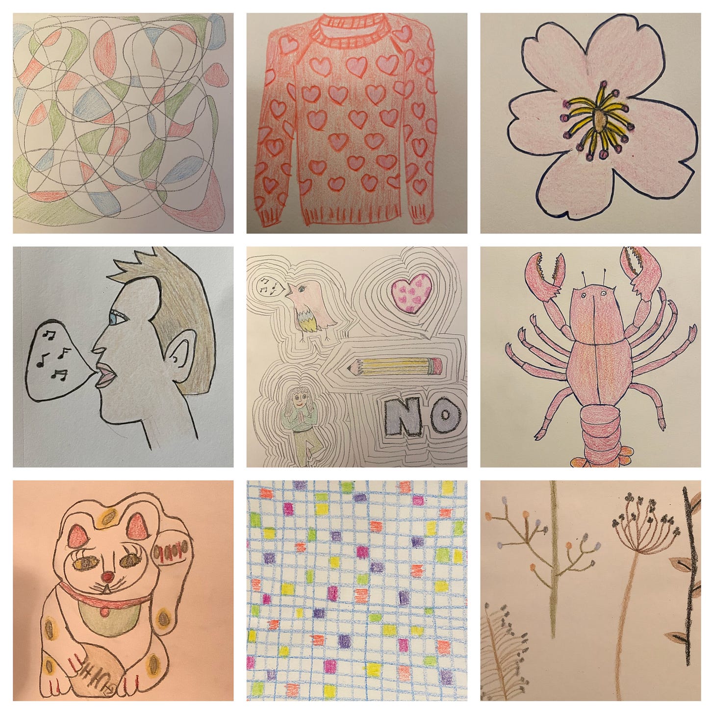 I’ve heard again and again that it’s good to have a creative side-pursuit you’re not especially good at, and drawing—with crayons, colored pencils, and markers—serves that purpose for me. Plus, I’ve just always loved it, so much so that I keep a small box of Crayolas and a tiny sketch pad in my weekend bag for when I visit my mom on Long Island, spend time in the city, or make short trips elsewhere. I find it soothing and meditative to draw, even badly, and to color in my drawings. I love the feeling of dragging a crayon back and forth across a piece of paper.