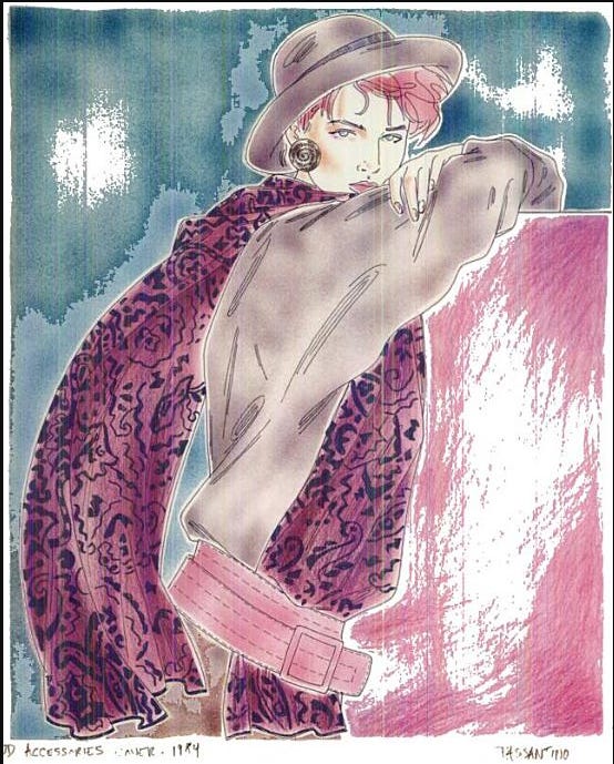 After working at a monthly publication, it was exhilarating to get back to the pace of a daily. I went out into “the market” a few days a week to visit accessories manufacturers and retailers, to get the scoop on the latest trends and happenings. I’d often return with samples that I then had to bring to the art department at the back of the newsroom so one of the fashion illustrators, brilliant artists like Steven Stipelman and Robert Passantino, could draw renderings of them.