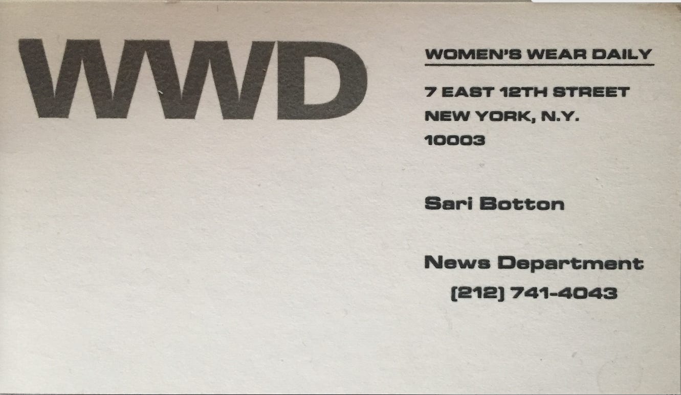 We’re back in March, 1988, I’m about 22-and-a-half, and I’ve just landed at my second post-college editorial job, at WWD, as an assistant editor on the accessories beat — covering the wonderful world of costume jewelry, handbags, small leather goods (wallets and whatnot), belts, hats, scarves, etc.