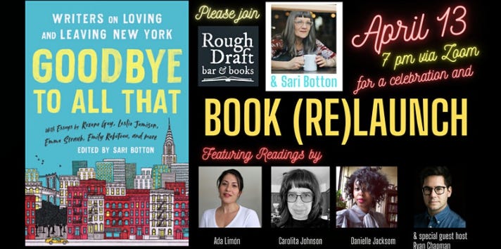 Thank you to everyone who subscribes to this newsletter and takes the time to read it (and sometimes respond, cheering me on). Thank you to everyone who has bought the updated edition of Goodbye to All That, and spread the word about it. Thank you to Books are Magic and Rough Draft Bar & Books for two fun Zoom events, to emcees Isaac Fitzgerald and Ryan Chapman, and the contributors who read. Thank you to LitHub for excerpting Emily Raboteau’s Goodbye to All That essay, “Shelter in Place,” and Harper’s Magazine for excerpting Leslie Jamison’s essay, “The Assistant’s Loft.”