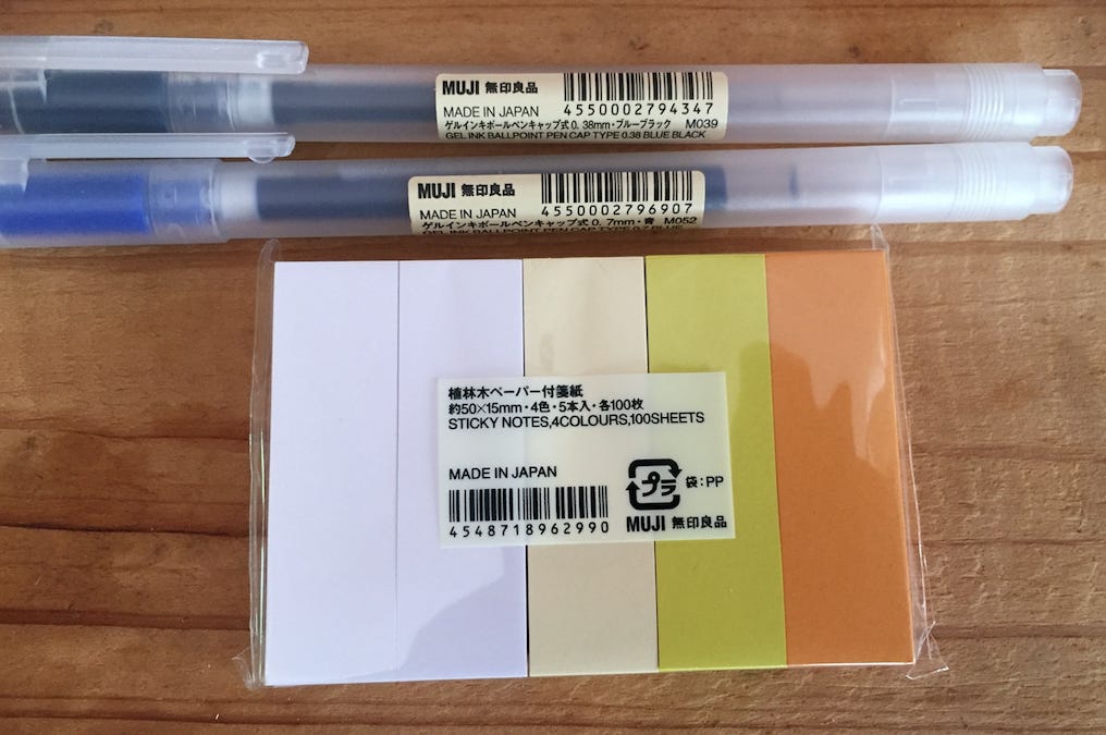 I envisioned this notebook/organizer, and then, as if I were able to magically manifest it, decided they must have it. But, no. Muji of course carried no such clunky thing. (Thatās more of a Mead-type item.) So, I left with just a couple of pens and some sticky page-markers, because 54 years in a capitalist society have taught me you canāt derive that wonderful if short-lived dopamine response without whipping out your debit card.