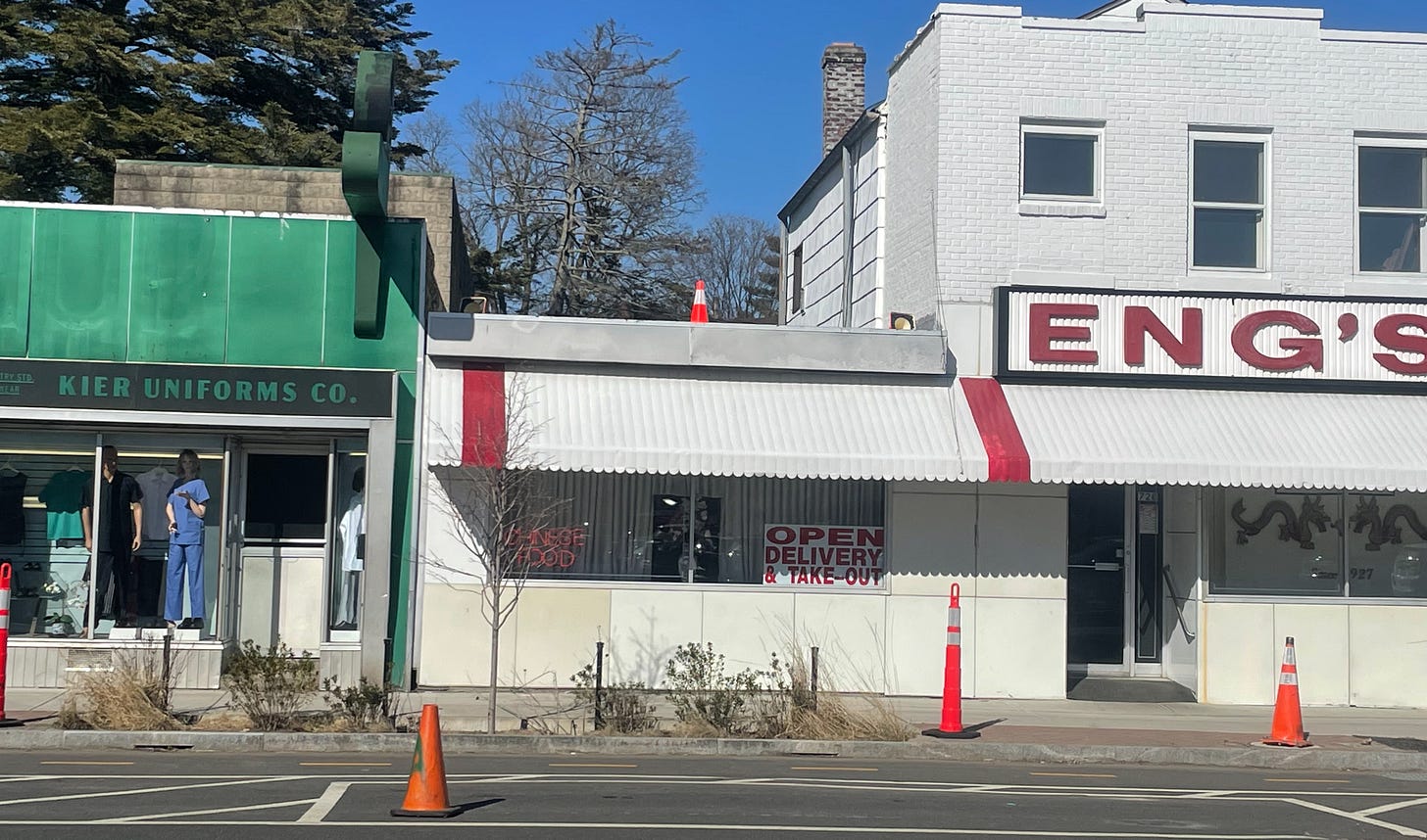 Today Apple TV’s Severance—one of my favorite shows—is shooting pretty much around the corner from my house in Kingston, NY. My husband Brian is working from home because the production has taken over the parking lot of his office building, located across the street from what appear to be sets: Eng’s Chinese restaurant and a former video store that has been repurposed as “Kier Uniforms Co.”
