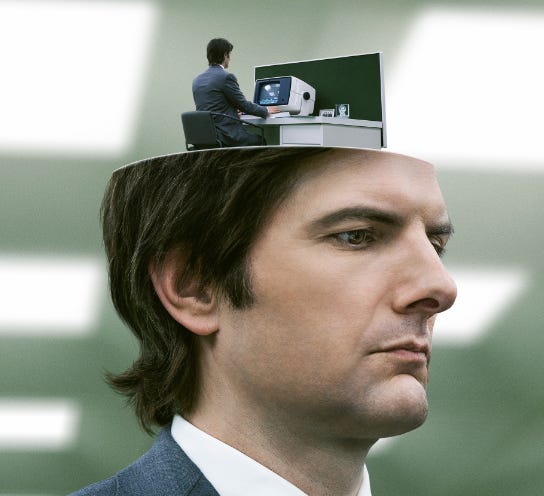 When I witness Adam Scott’s character, Mark S., struggling with grief and deep depression in his “outie” life as a(n alleged) widower, then being chipper and agreeable in his waking hours at Lumen, I understand the appeal of having a very separate “innie” life by day, with a version of me that goes somewhere else to be productive in some way for eight hours, free of all my “outie’s” emotional baggage.